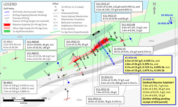 - 12.0m of 1.4% Zn+Pb, 560 g/t Ag, 2.30% Cu and 0.17% Sb (25-3552-31), including
