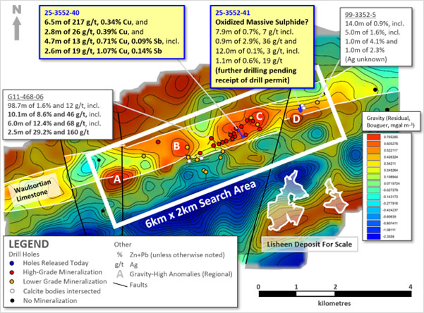 Hole 25-3552-41 intersected what is interpreted as oxidized massive sulphide mineralization within a fault zone. Despite being highly weathered, the interval returned highly anomalous metal concentrations: (i) 7.9m of 0.74% Zn+Pb (0.57% Zn and 0.17% Pb) and 7.4 g/t Ag (starting at 229.5m downhole), including 0.9m of 2.87% Zn+Pb (2.43% Zn and 0.44% Pb) and 35.9 g/t Ag; and (ii) 12.0m of 0.13% Zn+Pb (0.06% Zn and 0.07% Pb) and 3.3 g/t Ag (starting at 258.2m downhole), including 1.1m of 0.55% Zn+Pb (0.21% Zn and 0.34% Pb) and 18.6 g/t Ag. These intervals (7.9m and 12.0m) contained weathered-out cavities totalling 19% and 40% of their respective downhole lengths (assumed ‘nil’ grade in the above weighted-average calculations). It is possible that these cavities represent evidence of preferential weathering due to original high levels of mineralization (e.g. massive sulphide). Hole 25-3552-38 returned trace sphalerite and galena (from approx. 231-244m downhole) near the base of the Waulsortian Limestone, also suggesting proximity to higher-grade mineralization.