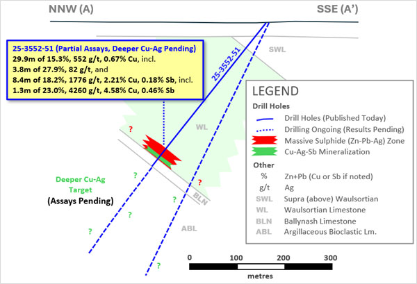 “Today’s results represent our best hole to date since inception of the Company back in 2015,” stated Bart Jaworski, CEO. “Hole 25-3552-51 intersected nearly 30m of excellent zinc and lead grades, including over eight metres of spectacular silver numbers, up to 4,260 g/t, coincident with very strong copper and antimony concentrations. The interval is hosted within a bedding-parallel massive sulphide zone interpreted to be close to true width. Importantly, this hole surprised to the upside, showing a previously unexpected 80m extension of the massive sulphide zone towards the SW, opening new expansion potential in this area. Importantly, this hole continues further down to test the Deeper Cu-Ag target below today’s interval. That work is ongoing with assays pending.”