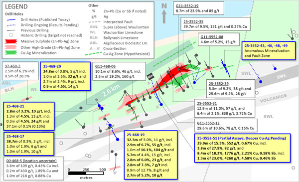 “Today’s other key development is the discovery of a significant new zone at the SW-end of the current discovery. Hole 25-468-19 intersected over 32m of mineralization, hosting four intervals, each nearly three metres thick, grading robust zinc-lead and silver. This new zone is 295m SSE of previously intersected high-grade mineralization, adding evidence of significant mineralization south of, and potentially parallel to, the current discovery trend. Follow-up drilling here is underway.”