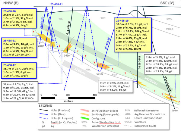 - 25-468-19 – new significantly mineralized zone in a 400m gap between two previously drilled holes along a drill fence at the SW portion of the Ballywire discovery: