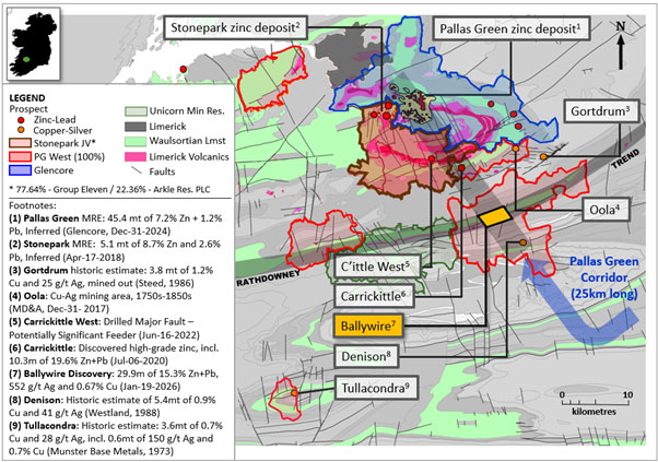 The Ballywire prospect at the Company’s 100%-owned PG West Project in Republic of Ireland, represents the most significant mineral discovery in Ireland in over a decade. First announced in Sept-2022, the discovery has 73 holes drilled and reported by Group Eleven to date, including the most recent nine holes (25-468-17, -19, -20, -21; 25-3552-43, -46, -48, -49 and -51) reported today (see Exhibits 1 to 6).