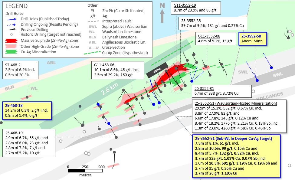 - 25-3552-51 – Extends previous interval announced on 19-Jan-2026, totalling 29.9m of 15.3% Zn+Pb, 552 g/t Ag and 0.67% Cu (from 338m downhole, at base of Waulsortian Limestone), to: