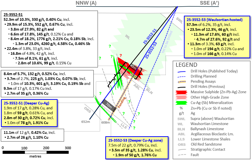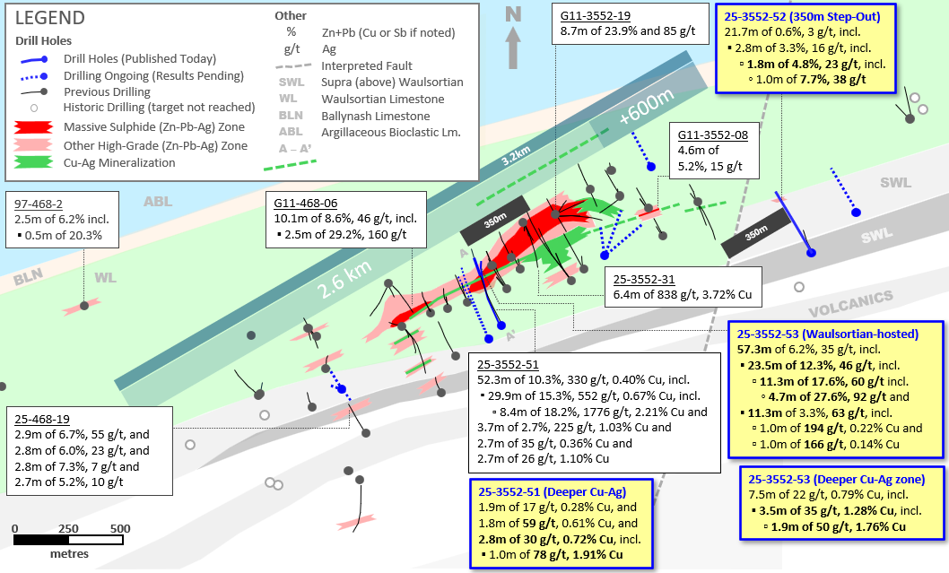 - 25-3552-53 – Extends previous interval from 25-3552-51 announced on 19-Jan-2026, totalling 29.9m of 15.3% Zn+Pb, 552 g/t Ag and 0.67% Cu (from 338m downhole, at base of Waulsortian Limestone), downdip and to the SE along two zones:
