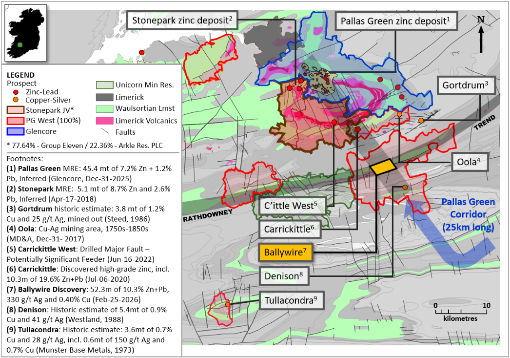 The Ballywire prospect at the Company’s 100%-owned PG West Project in Republic of Ireland, represents the most significant mineral discovery in Ireland in over a decade. First announced in Sept-2022, the discovery has 77 holes drilled and reported by Group Eleven to date, including the most recent two new holes (25-3552-53 and -52) reported today. Today’s results from 25-3552-51 are in addition to partial assays announced on 19-Jan-2026 and 25-Feb-2026. All of today’s results are summarized above and below (see Exhibits 1 to 5).