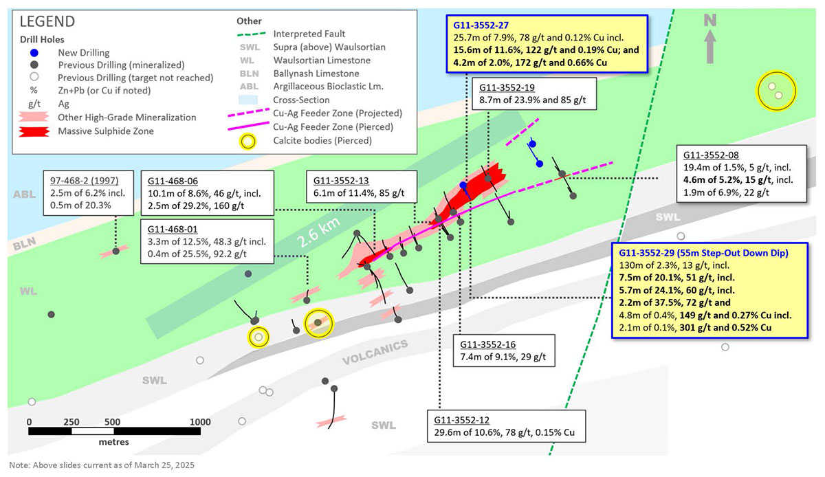 - 15.6m of 11.6% Zn+Pb, 122 g/t Ag and 0.19% Cu (G11-3552-27)