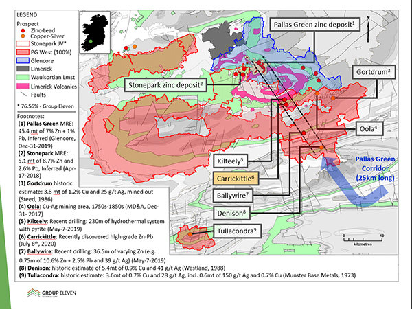 Vancouver, Canada, September 30, 2020 - Group Eleven Resources Corp. (TSX.V: ZNG; OTC: GRLVF; FRA: 3GE) (“Group Eleven” or the “Company”) is pleased to announce that it has commenced drilling at the Carrickittle zinc prospect (“Carrickittle”) on the Company’s 100%-interest PG West project (“PG West”) in the Republic of Ireland.