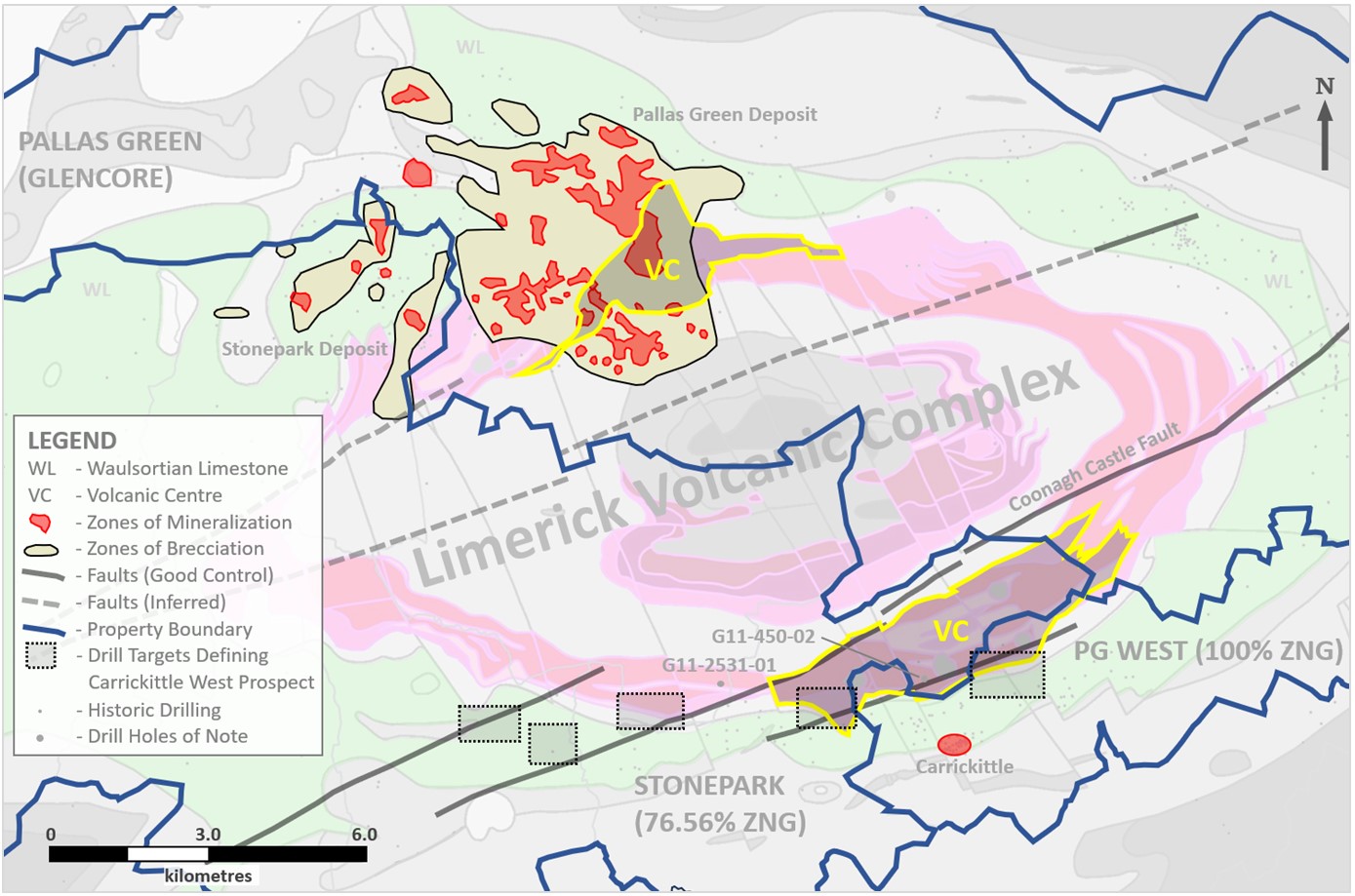 Note: Pallas Green MRE is 45.4 million tonnes of 8.4% Zn+Pb (7.2% Zn + 1.2% Pb), Inferred (Glencore, Dec-31-2023); Stonepark MRE is 5.1 million tonnes of 11.3% Zn+Pb (8.7% Zn and 2.6% Pb), Inferred (Apr-17-2018); Outline of volcanic centres (“VC”) derived from Peter Strogen (1983); G11-2531-01 intersected SW extensions of the Coonagh Castle Fault (news release dated 16-Jun-2022)