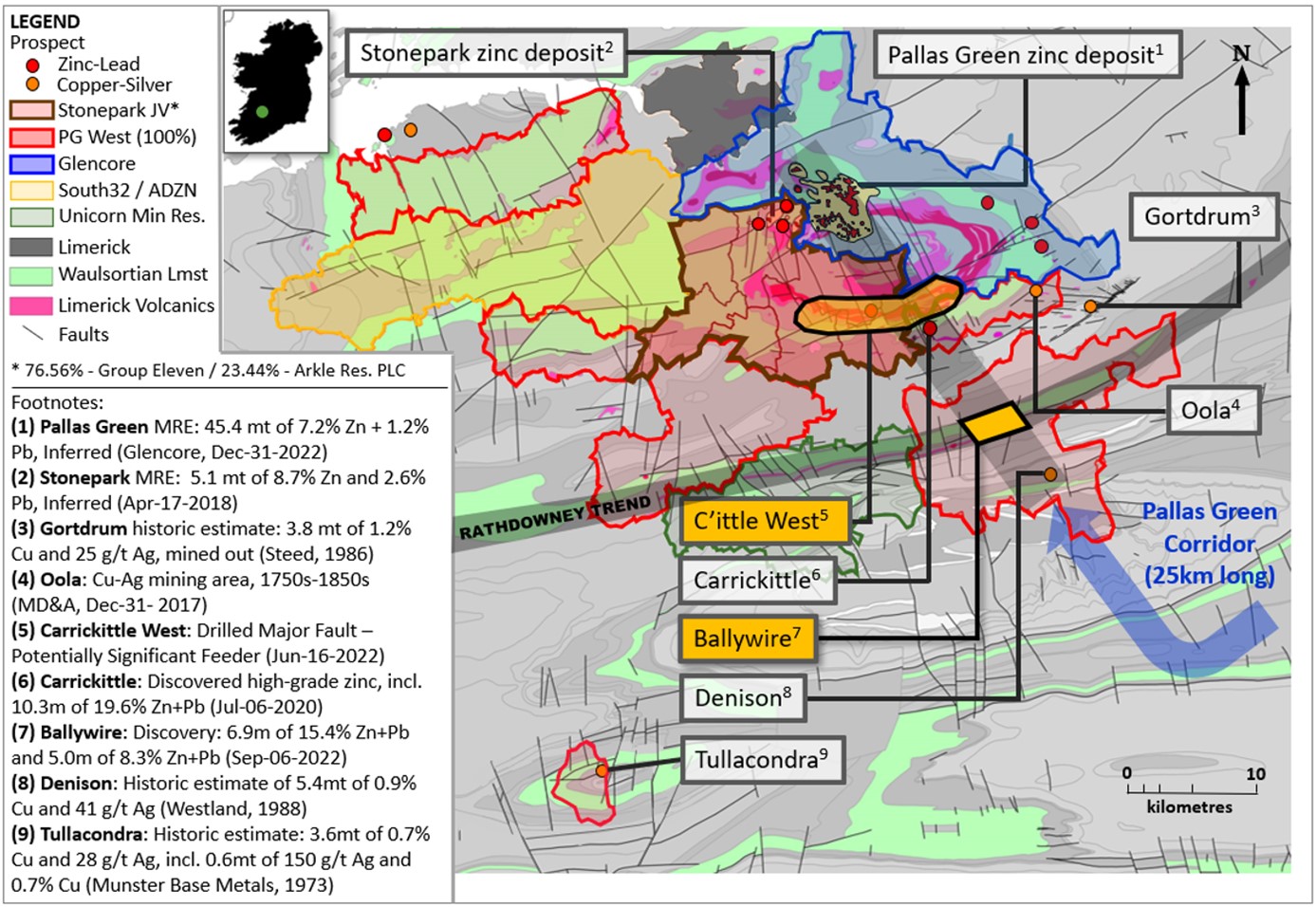 - Targets include areas of brecciation and mineralization seen in previous drilling, the Kilteely volcanic centre and the SW extensions of the Coonagh Castle Fault (first intersected by Group Eleven, see news release dated 16-Jun-2022)