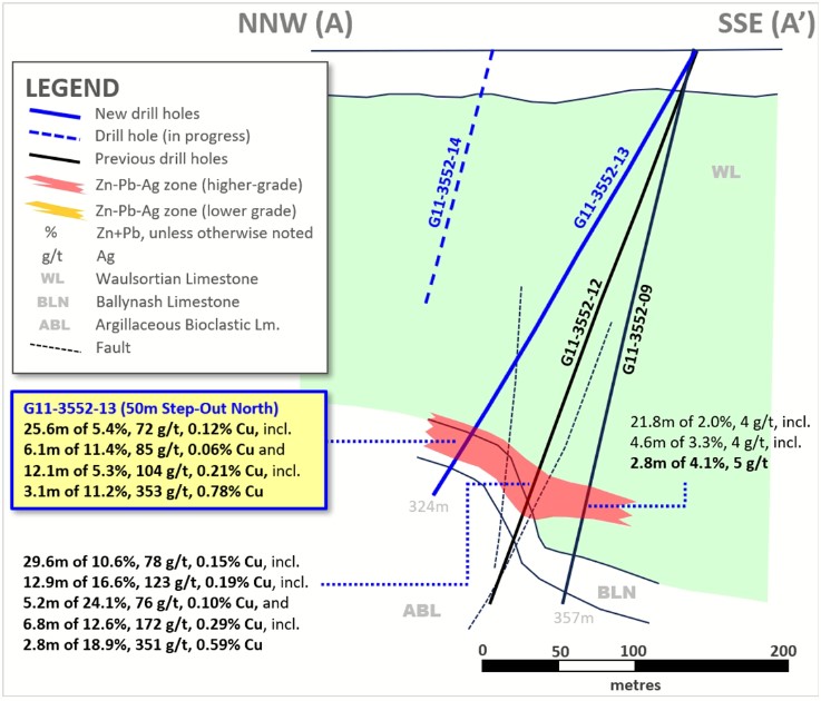 - 50m step-out (hole G11-3552-13) up-dip from best intersection to date at Ballywire (29.6m of 10.6% Zn+Pb, 78 g/t Ag and 0.15% Cu in G11-3552-12, see news released dated 11-Jun-24), intersected a robust zone of 25.6m of 5.4% Zn+Pb (2.8% Zn and 2.6% Pb), 72 g/t Ag and 0.12% Cu, from 271.9m down-hole, including: