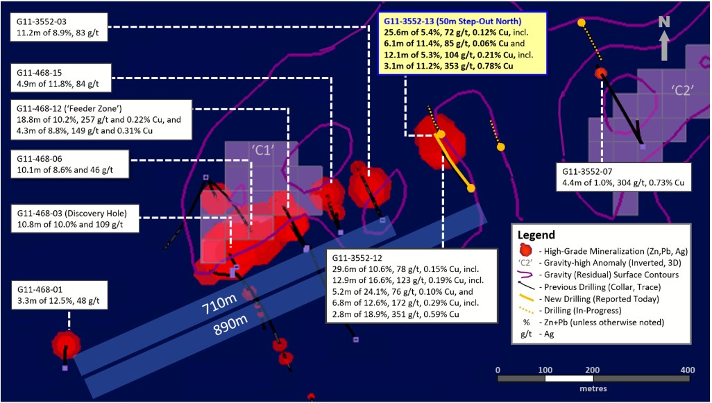- 11.2m of 8.9% Zn+Pb and 83 g/t Ag (G11-3552-03)