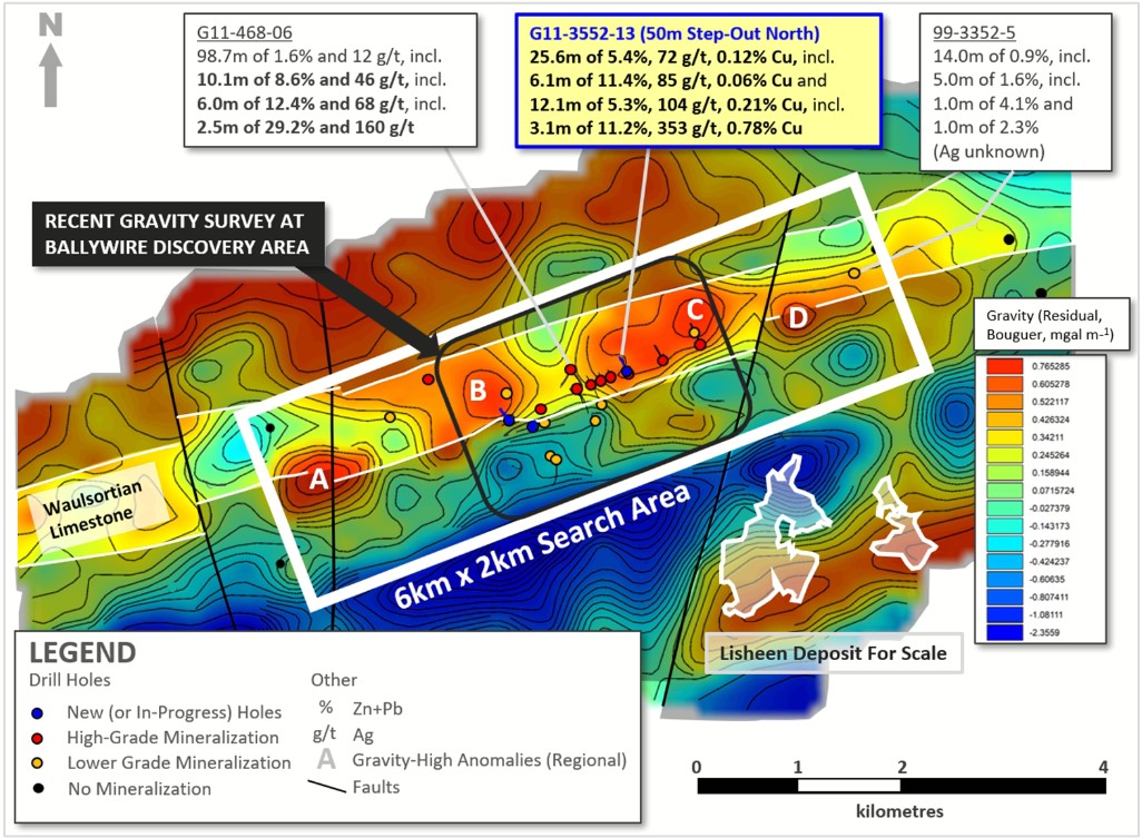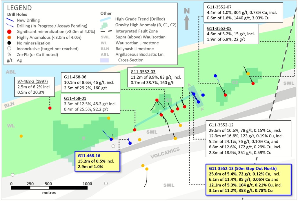 “We are excited that the high-grade footprint of the Ballywire discovery continues to grow at a rapid pace,” stated Bart Jaworski, CEO. “Today’s results expand high-grade zinc-lead-silver mineralization along dip by 50m north from G11-3552-12, our best hole drilled to date at Ballwire. It is also encouraging to see high-grade silver and elevated copper. To date, we have intersected robust mineralization at Ballywire over a strike length of 2.6km, along a prospective trend of over 6km. Together with continued robust intervals of massive sulphide, Ballywire is continuing to show signs of a major zinc-lead-silver discovery. We look forward to providing further drill results over the coming few weeks.”