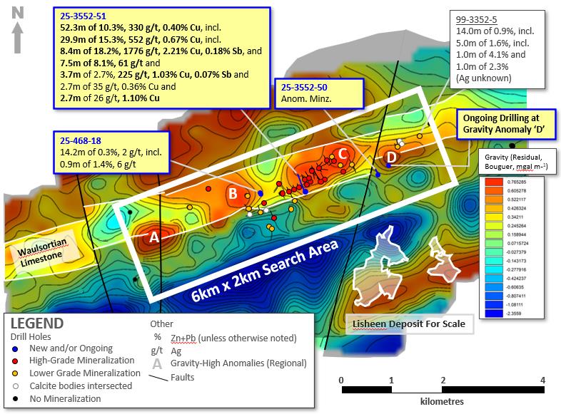 Hole 25-3552-50 was drilled approx. 400m ESE of its nearest drill hole (25-3552-49), on the far east portion of the Ballywire discovery (see Exhibit 2 and 6), approx. halfway towards gravity anomaly D (currently being drill tested). This hole returned anomalous mineralization totalling 2.9m of 0.04% Zn+Pb (0.04% Zn and 0.01% Pb) (from 406m downhole), adding confidence in vectoring towards anomaly D.